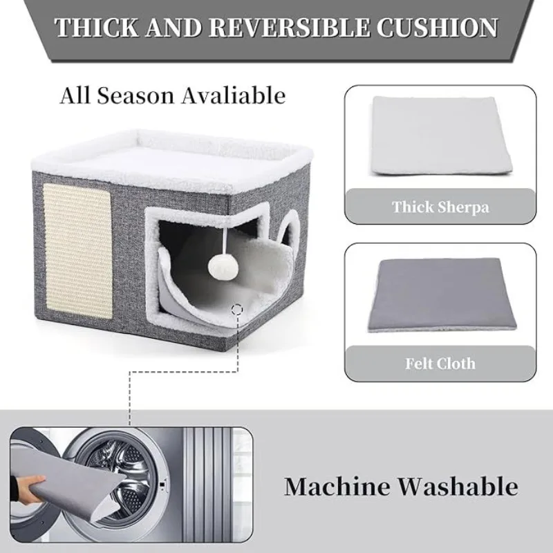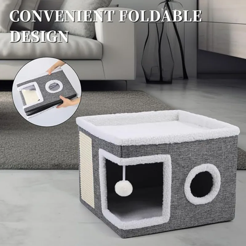 Multi-Level Cat House, Indoor Foldable Design Cat Bed, Scratching Board & Non-Slip Base 30LB Capacity, Warm Cat Bed Cat Cave